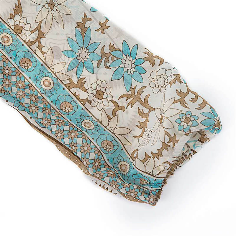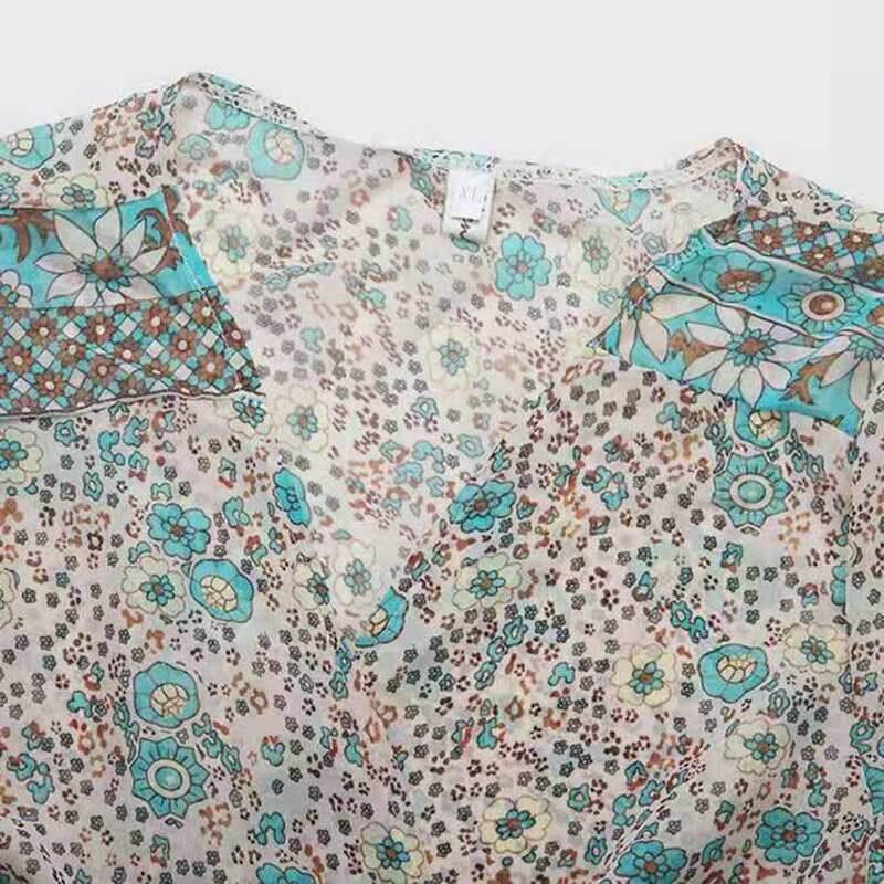 Ein Kleidungsstil, der vom Lebensstil der Freigeister inspiriert ist. Verwandeln Sie sich in eine bezaubernde Göttin mit diesem eleganten Maxikleid aus Chiffon mit Spitzenverzierung. Es ist aus dünnem, luftigem Chiffon mit Blumendruck und böhmischen Akzenten vorne und an den Schultern gefertigt.