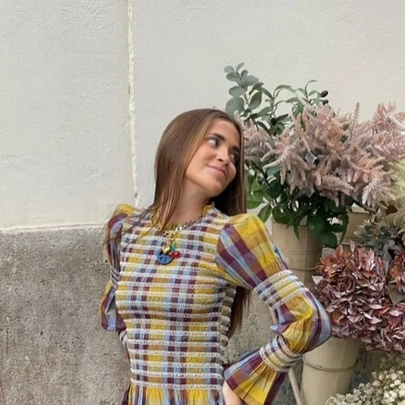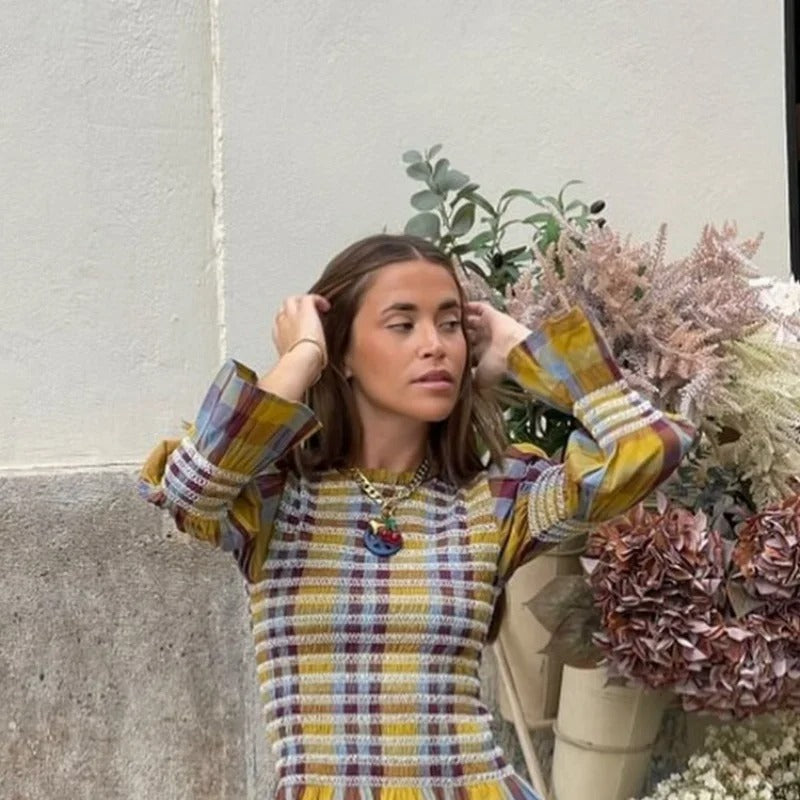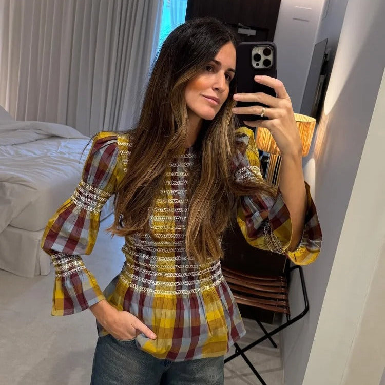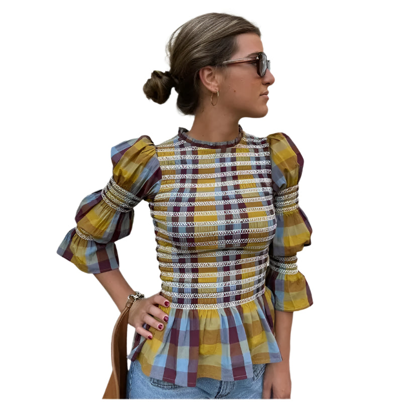 Treten Sie selbstbewusst auf mit unserem karierten T-Shirt mit Puffärmeln für Damen – eine perfekte Mischung aus lässigem Charme und zeitgemäßem Design. Dieses schmal geschnittene T-Shirt hat ein schickes Karo-Kontrastmuster, das Ihrem Alltagslook einen Hauch von Raffinesse verleiht. Die Puffärmel und der plissierte Rundhalsausschnitt sorgen für genau das richtige Maß an Flair und machen es zu einer vielseitigen Wahl für Freizeitaktivitäten, Kaffeeverabredungen oder einen Tag im Büro.