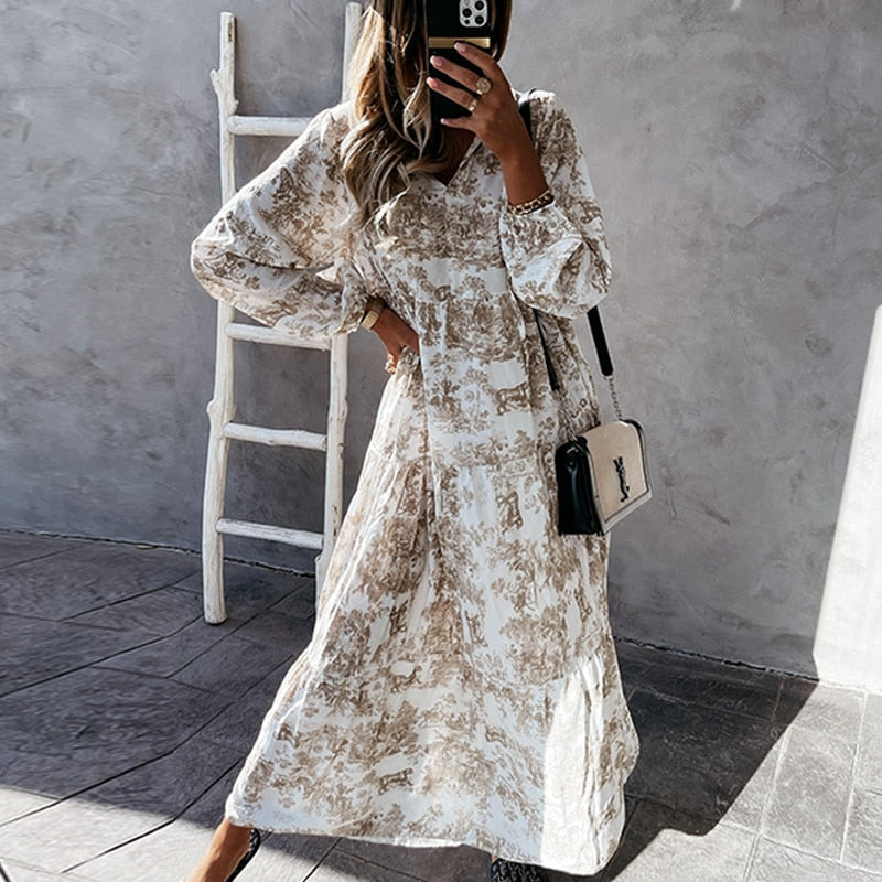 Das Zaira Maxi Kleid besticht durch sein ansprechendes Design mit langen Ärmeln, einem eleganten V-Ausschnitt und verspielten Rüschendetails. Es ist ideal für entspannte Ausflüge oder lässige Treffen und sorgt für einen modischen Auftritt.
