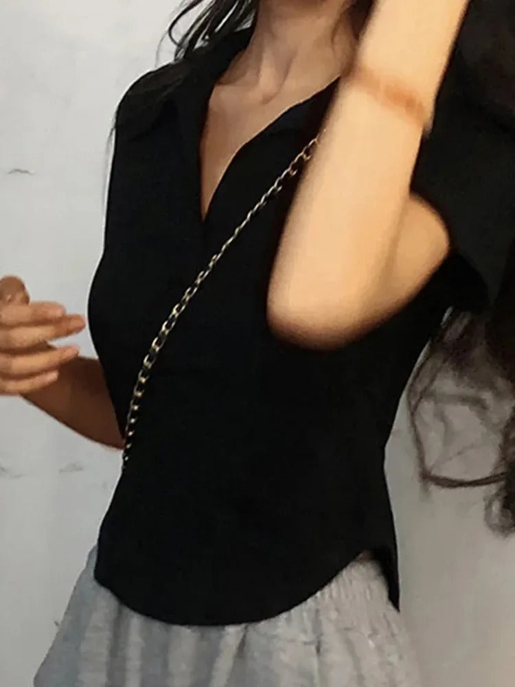 Dieses kurzärmelige Damenoberteil mit Revers ist die perfekte Ergänzung für Ihre Alltagsgarderobe. Mit seinem schmeichelhaften V-Ausschnitt und dem modernen Reversdetail vereint es auf perfekte Weise Eleganz und Komfort. Die schmale Passform betont Ihre natürliche Silhouette, während das weiche, atmungsaktive Material den ganzen Tag über für Komfort sorgt.