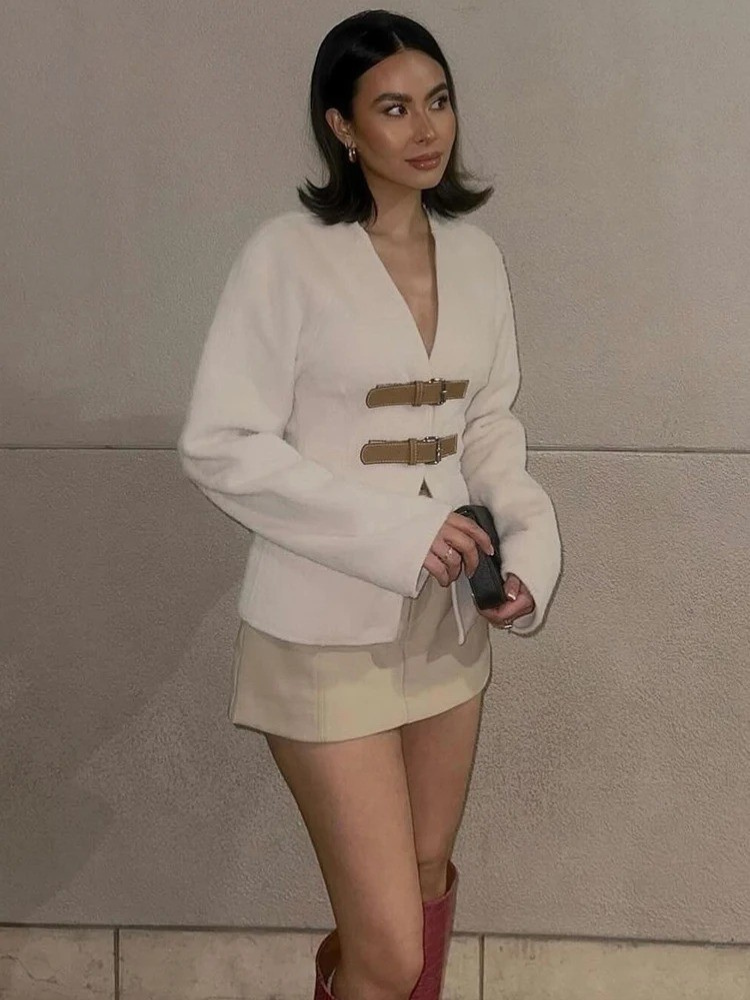Diese Jacke ist aus hochwertiger Wolle gefertigt und mit einzigartigen Lederschnallendetails verziert. Sie ist perfekt, um sie über Ihren Lieblingsoutfits zu tragen. Egal, ob Sie zu einem legeren Ausflug oder einer formellen Veranstaltung gehen, der vielseitige Stil wird Sie überall auffallen lassen.