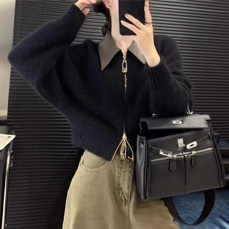 Bereichern Sie Ihre Garderobe mit diesem stilvollen Strickpullover mit Lederkragen, der Komfort und zeitlose Attraktivität vereint. Diese Strickjacke mit Doppelreißverschluss hat einen schicken Kragen aus Spaltleder und eine weiche Strickstruktur und eignet sich perfekt für den Lagenlook zu jeder Jahreszeit. Sie ist vielseitig einsetzbar und lässt sich mühelos mit lässigen und formellen Outfits kombinieren, was sie zu einem Must-have für jeden Anlass macht.